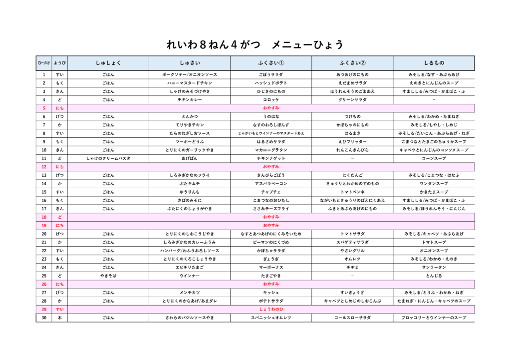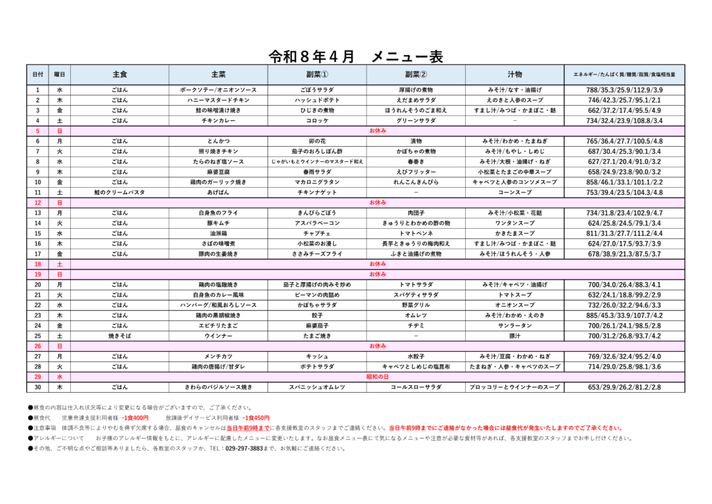 2026年4月 お弁当メニュー